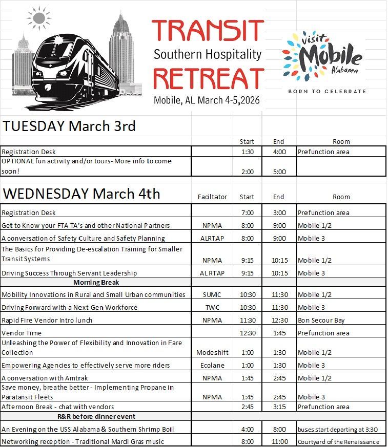 Updated September 29, 2025 - This is a Preliminary Agenda, the Retreat will have over 15 learning sessions over 2-days. The agenda will grow and adapt as more National Partners are confirmed. For the latest updates on the agenda, please email Tim Geibel at tgeibel@catabus.org